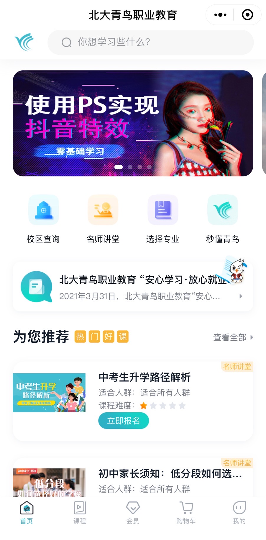 2020年9月30日EVO视讯官方网站正式签约北大青鸟,制作北大青鸟微信小程序。目前已正式上线并使用。我们凭借多年的小程序开发定制服务经验,根据北大青鸟专业职业教育的特性,专业为北大青鸟定制属于他自己的小程序--“北大青鸟职业教育”。给更多的学员提供了选课、报名、咨询等提供了更方便快捷的路径。
